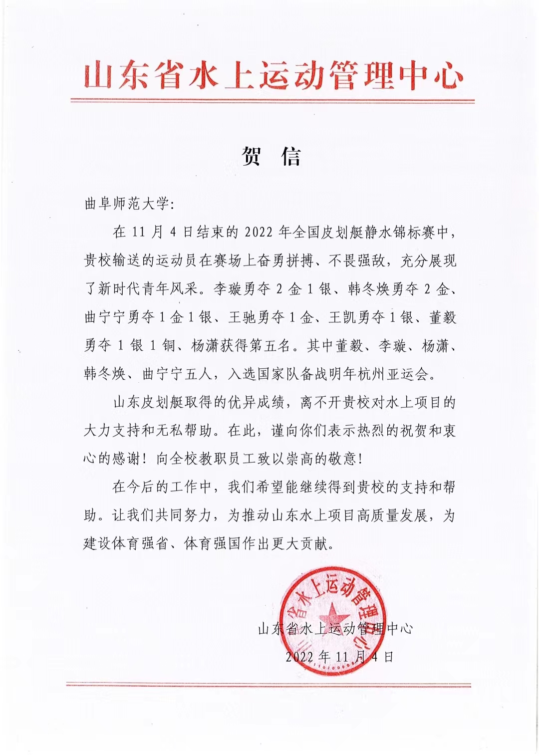 赛后,山东省水上运动管理中心给我校发来贺信,信中表示,山东皮划艇取得的优异成绩,离不开贵校对水上项目的大力支持和无私帮助,在今后的工作中,希望能继续得到贵校的支持和帮助。在信中,山东省水上运动管理中心还告知学校,董毅、李璇、杨潇、韩冬焕、曲宁宁五人已经入选国家队备战明年杭州亚运会。