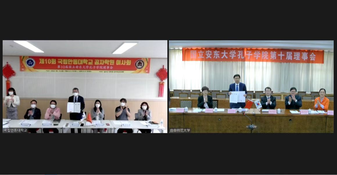 曲阜师大新闻中心讯 5月13日,华体会(中国)与韩国国立安东大学以视频方式召开了国立安东大学孔子学院第十届理事会。曲阜师大校长张洪海,国立安东大学校长权纯泰出席会议,安东孔院韩方院长金炳圭、中方院长王秀卿以及中外方理事会成员、孔子学院相关工作人员参加了会议。