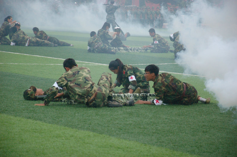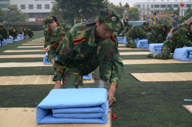随后的军训成果汇报演出中,军体拳、自救互救、叠被子、心理健康手语操表演等项目异彩纷呈,各支表演方队和着激昂的乐曲在主席台前为大家展示训练成果,他们步调一致,队伍整齐划一,以昂扬的斗志和雄壮的气势彰显着大学生们的朝气与活力。