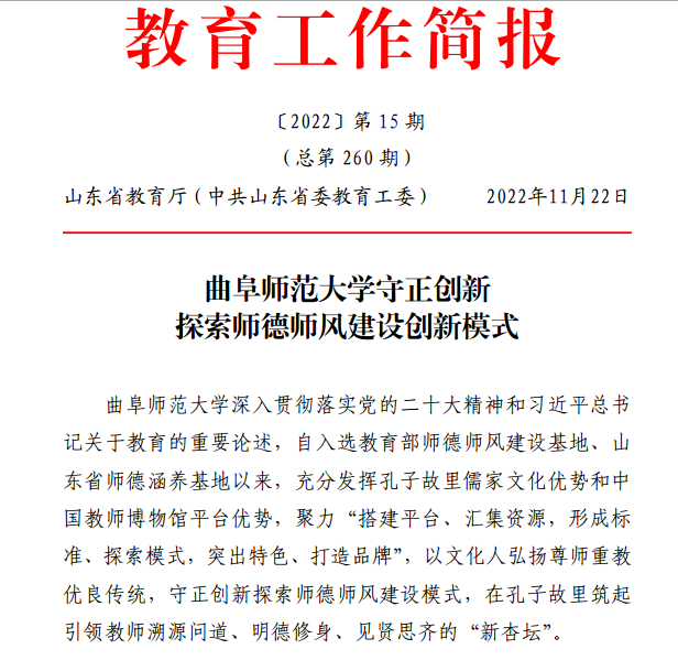 曲阜师大新闻中心讯(记者:袁玭 编辑:袁玭 责编:李文振) 11月22日,山东省教育厅《教育工作简报》2022年第15期专题刊发《华体会(中国)守正创新探索师德师风建设创新模式》文章,从“保护教育遗产,讲好师德师风故事” “发挥独特优势,开发师德教育资源” “研制特色课程,打造师德涵养高地”“增进国际交流,擦亮教师文化名片”四个方面,向全省教育系统介绍了曲阜师大以文化人弘扬尊师重教优良传统、守正创新探索师德师风建设模式的特色工作和典型经验。