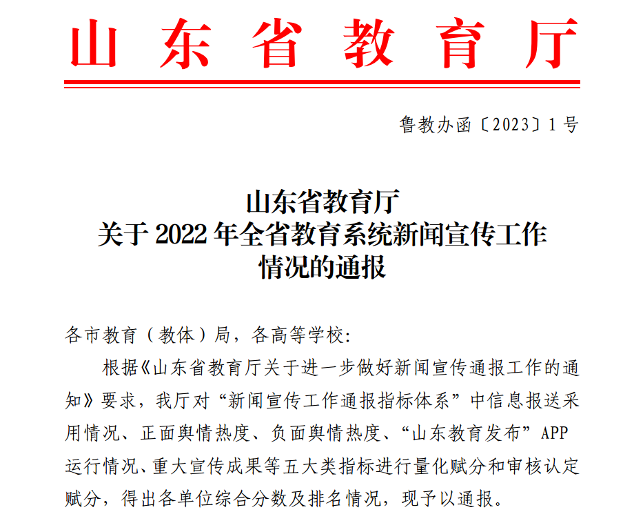 根据《山东省教育厅关于进一步做好新闻宣传通报工作的通知》要求,本次通报对“新闻宣传工作通报指标体系”中信息报送采用情况、正面舆情热度、负面舆情热度、“山东教育发布”APP运行情况、重大宣传成果等五大类指标进行量化赋分和审核认定赋分,评出各单位综合分数及排名情况。