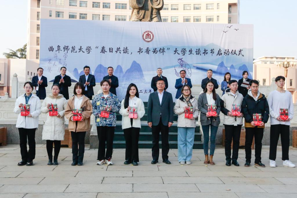 仪式上,校团委书记孔轶众宣读了《关于在全校学生中开展“春日共读,书香为伴”大学生读书节的实施方案》。图书馆馆长王东波宣读了《山东省高校师生“奋进新征程,建功新时代”系列阅读活动获奖名单》。与会领导为获奖同学代表赠书。三名学生代表现场进行了好书分享。最后,师生观看了历史文化学院带来的“书香润心灵,百人齐颂唱”经典诵读节目,通过诵读经典章句体悟传承千年的文化力量。