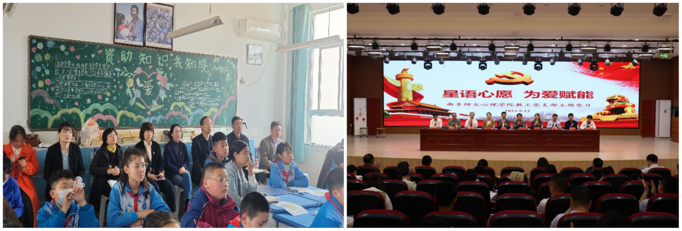 心理学院教工党支部与曲阜市教师教育发展服务中心党支部开展支部联建(左图),赴泰安开展主题党日志愿服务(右图)