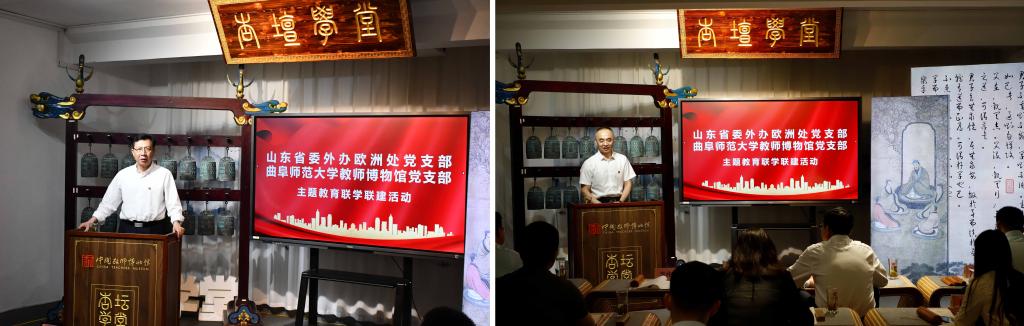 座谈会后,林海滨一行来到教师博物馆开展现场教学,举行省委外办欧洲处党支部与教师博物馆党支部主题教育联学联建活动。泰山学者成积春教授围绕讲仁爱、重民本、守诚信、崇正义、尚和合、求大同,解读了儒家文化的当代价值;欧洲处党支部书记周家伦领学了习近平总书记在文化传承发展座谈会上的重要讲话精神,并结合工作实际谈了心得体会;欧洲处副处长林春妹、博物馆副馆长刘永作了交流发言。活动最后,林海滨、李兆祥作了总结点评,就深入学习习近平总书记重要论述和重要讲话精神,强化党建引领、增进文化自信、推动中华优秀传统文化传承、提高国际传播能力提出了要求。