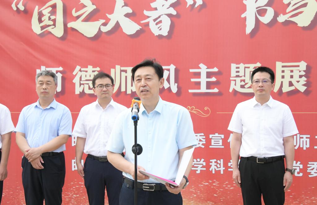 曲阜师大数学科学学院讯 为深入学习贯彻习近平总书记关于加强师德师风建设的重要论述,落实立德树人根本任务,营造涵养师德、争做“四有”好老师的良好氛围,6月18日下午,曲阜师大举办“胸怀‘国之大者’,书写教育担当”师德师风主题展。本次活动由学校华体会官方网、教师工作部主办,数学科学学院党委承办。学校党委副书记、校长张洪海,党委常委、宣传部部长孙祥广出席展览开幕式。数学科学学院即将走向教师岗位的全体毕业学子以及部分教师代表参加了开幕式。开幕式由数学科学学院党委书记宋国栋主持。