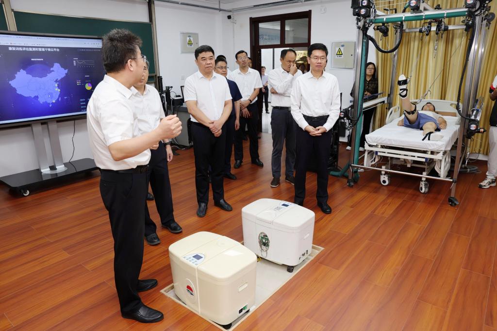 走访慰问期间,李在武与武玉强教授亲切交流,听取了武玉强教授及其团队关于康复与护理机器人、非线性控制、脑-机接口、智能控制与应用等技术开发、转化及应用情况的介绍,参观了山东省高等学校康复与护理智能机器人协同创新中心、飞控实验室、智能制造实验室,现场观摩了康复训练机器人操作、无人机和无人车协同控制模拟、工业机器人演示。