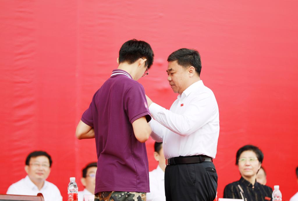 党委书记邢光为新生代表佩戴校徽
