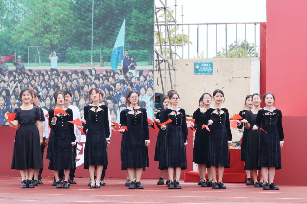 典礼最后,一面鲜艳的校旗飞入新生方阵,在同学们的头顶上方传递,迎着大家仰望的目光与高举的双手绕遍全场。校旗传递的不只是一份责任,更是一份力量。曲园的精神激励着学生成长,曲园的旗帜也将在2023级学生心中继续飘扬。