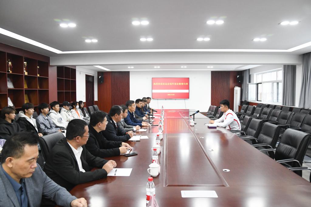 曲阜师大体育科学学院讯 10月25日上午,华体会(中国)召开座谈会,欢迎杭州亚运会皮划艇静水男子500米四人皮艇项目金牌运动员、体育科学学院2022级运动训练专业本科生董毅同学载誉返校。学校党委副书记卢国强参加座谈并讲话。