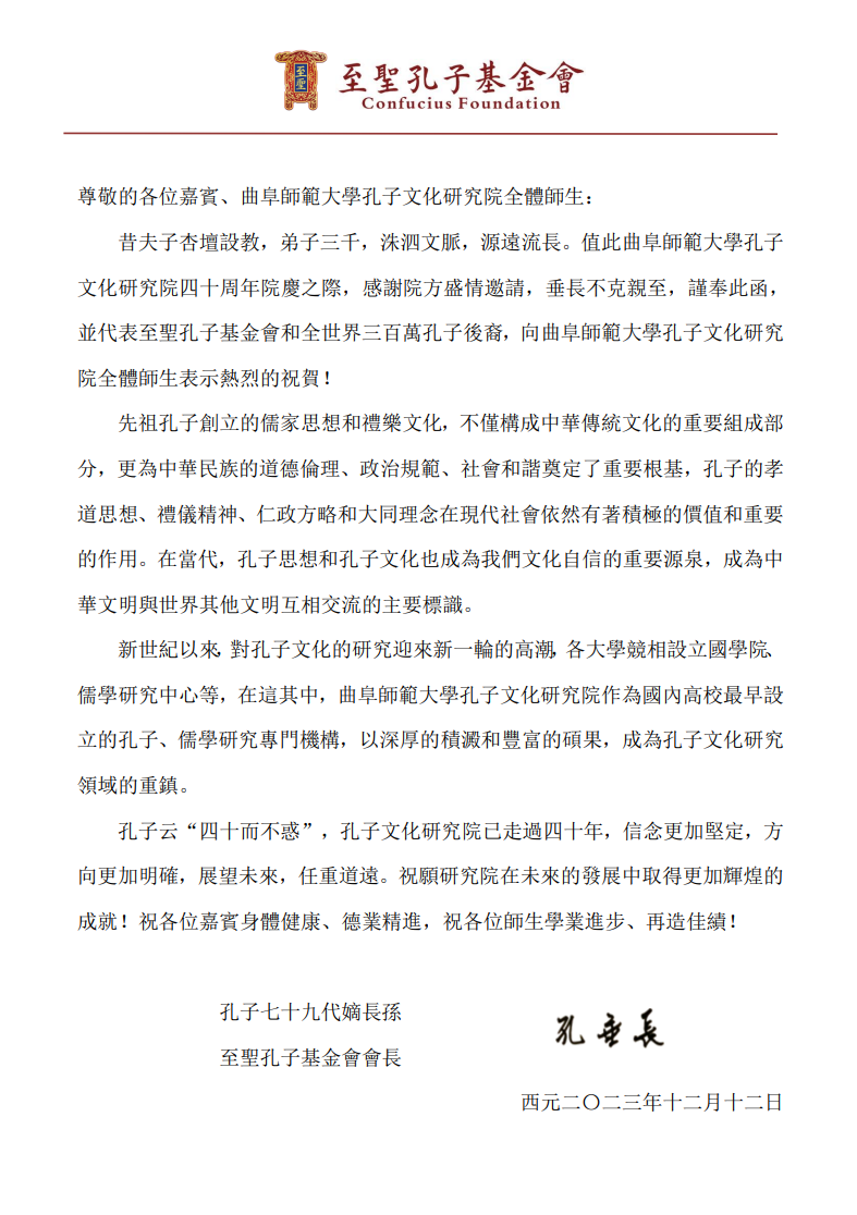 孔子七十九世孙、至圣孔子基金会会长孔垂长,复圣颜子七十九世孙、世界颜氏宗亲联谊总会会长颜秉刚,清华大学国学研究院院长陈来、武汉大学国学院名誉院长郭齐勇、中国人民大学孔子研究院名誉院长张立文、中国哲学史学会会长杨国荣等先生,中华孔子学会、中国先秦史学会,韩国成均馆大学、日本东京大学、俄罗斯科学院中国与现代亚洲研究所、越南及北京大学儒学研究院、南京大学中国思想家研究中心、山东大学儒学高等研究院、湖南大学岳麓书院等学术单位为孔子文化研究院四十华诞发来贺信贺电80余封,对孔子文化研究院赓续孔子之道,弘扬儒家文明做出的卓越贡献给予肯定,祝愿孔子文化研究院未来取得更大成就。