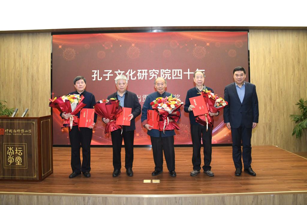 开幕式上,举行了突出贡献奖颁奖典礼。骆承烈、黄怀信、傅永聚、杨朝明、成积春、郭沂、刘彬等七位先生为孔子文化研究院四十年学术研究和学科建设做出突出贡献受到表彰,邢光为突出贡献奖获得者颁发了获奖证书,孔子文化研究院青年教师向获奖者献花致敬。