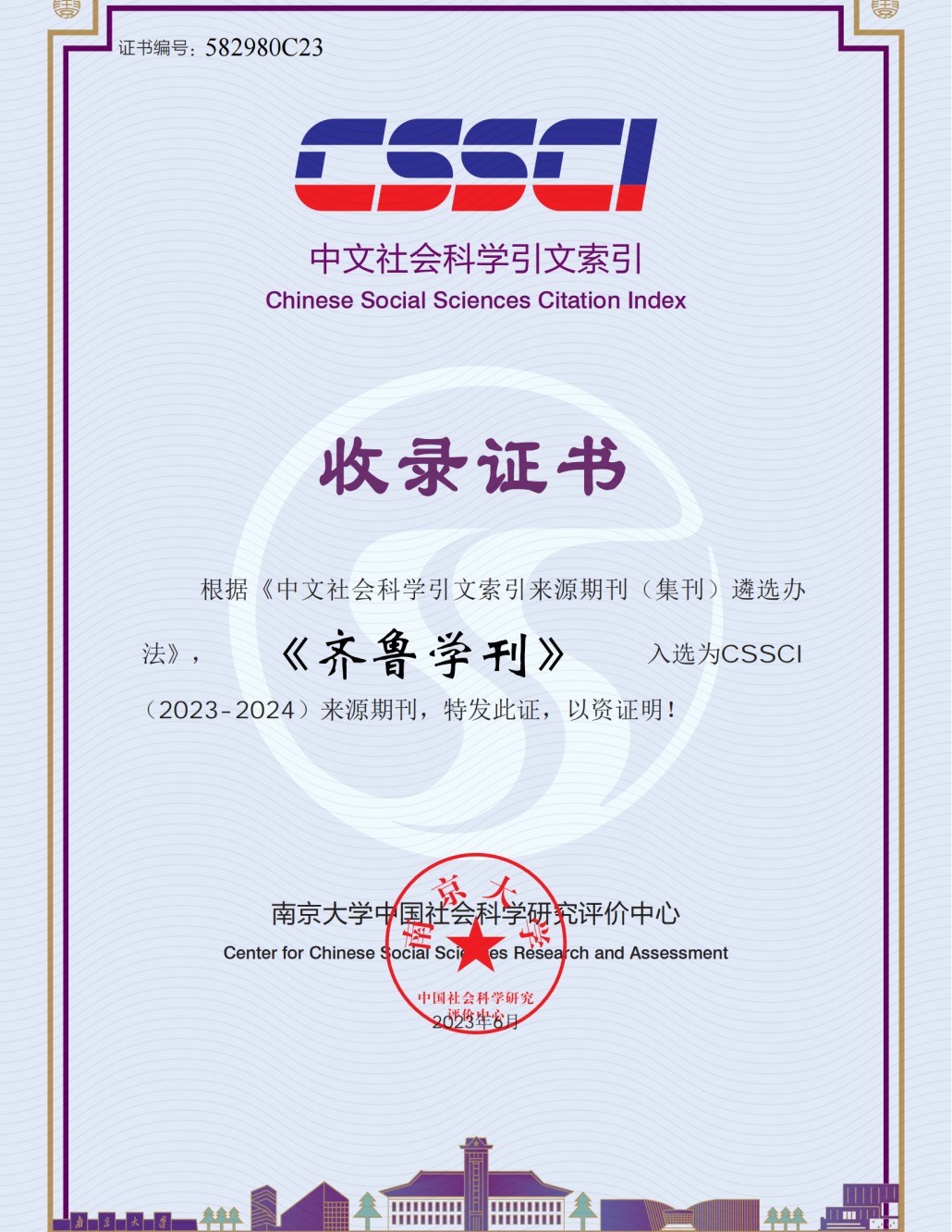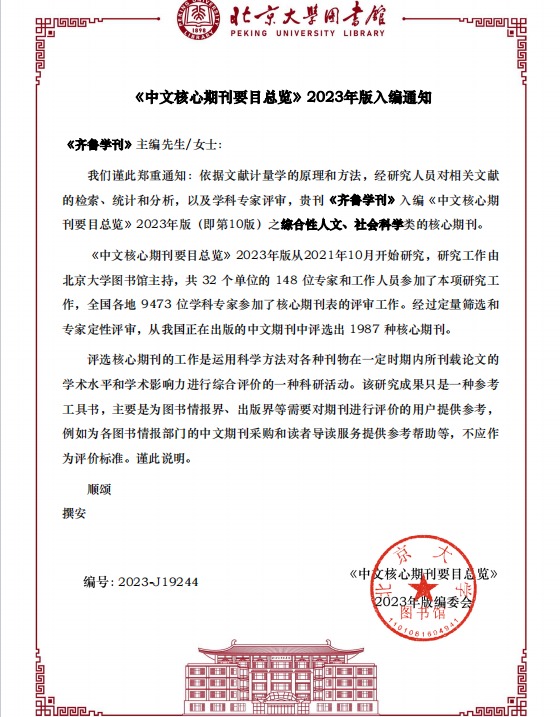 曲阜师大《齐鲁学刊》编辑部讯 日前,依据文献计量学的原理和方法,经研究人员对相关文献的检索、统计和分析,以及学科专家评审,《齐鲁学刊》再次入编《中文核心期刊要目总览》2023年版(即第10版)之综合性人文、社会科学类核心期刊。