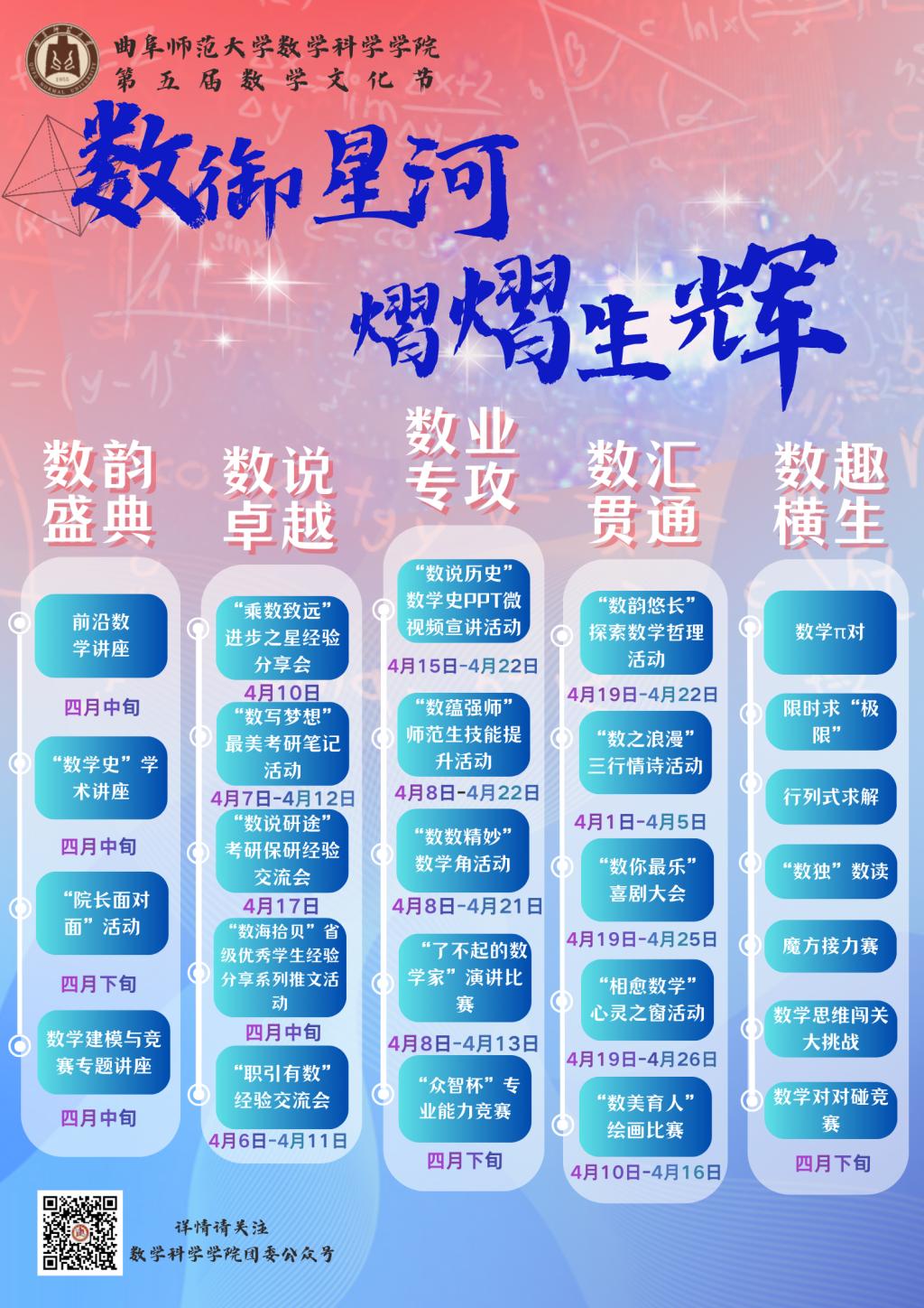 学校部署开展本科教育教学思想大讨论以来,数学科学学院积极响应,迅速行动,启动了“曲园数学角”,开展“每日一题”和基础课程“章章通”等活动;成立了杏坛学堂卓越班,探索拔尖人才培养新模式,开启了一系列有意义的探索。本届数学文化节以“数御星河,熠熠生辉”为主题,共分为“数”韵盛典、“数”说卓越、“数”业专攻、“数”汇贯通、“数”趣横生五个主题,以服务学生成长成才为目标,以弘扬数学文化、传承数学家精神为主线,是立足数学学科特色打造的育人品牌活动。下一步,学院将进一步优化数学人才培养体系,为深入推进本科教育教学思想大讨论贡献数学力量。