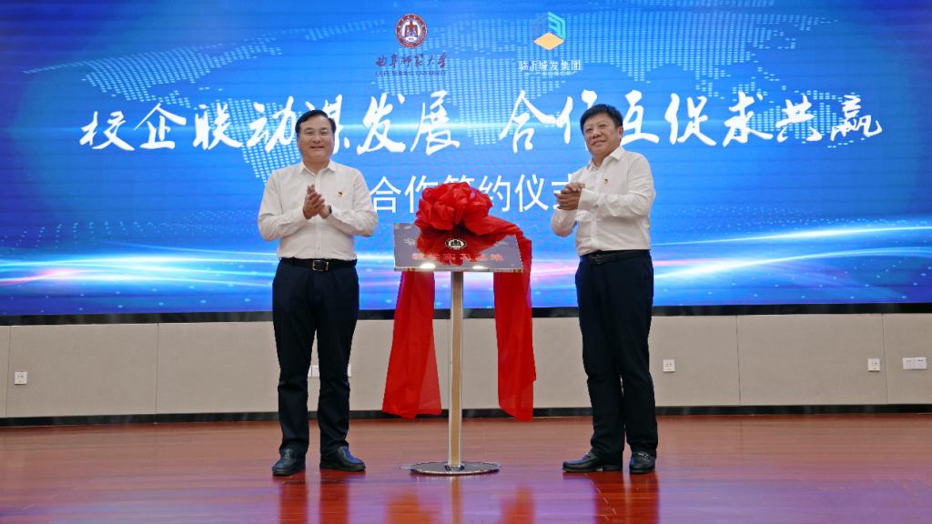 陈刚与李炜签订《校企合作框架协议》,并为教学实习基地揭牌。
