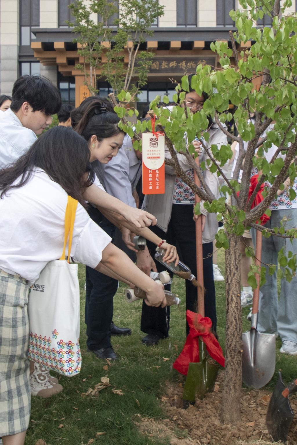 活动期间,两校师生围绕教育家精神分享了独到见解,发布了青年师德宣讲团首批研修成果,并在教师博物馆前共植师道嘉木,香港教育大学师生将带来的水和土汇入一棵杏树,象征着深植祖国大地、共同弘扬中华师道精神。