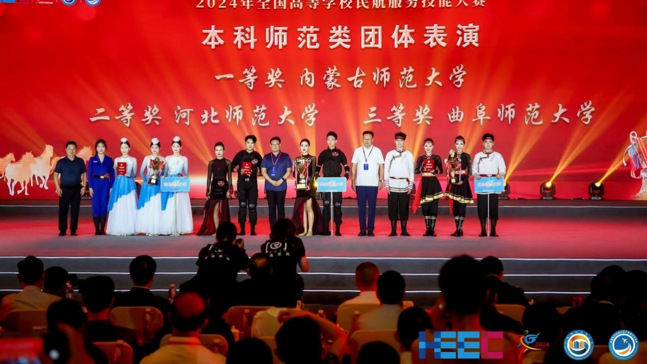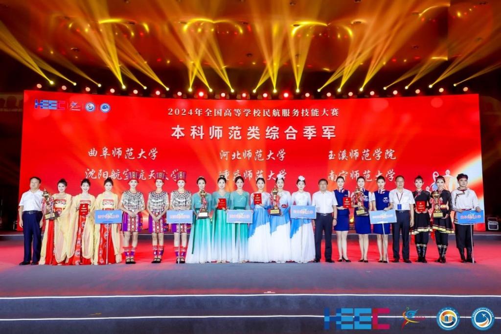 2024年全国高等学校民航服务技能大赛围绕“匠心筑梦新时代,精技强能向未来”主题,通过民航服务形象与礼仪、民航知识与英语、民航安全服务技能以及团体表演等内容的比拼,曲阜师大学子荣获本科师范组综合季军、民航安全服务技能三等奖,舞蹈《希格希日》荣获团体表演三等奖,崔亚辉、黄晓坤、殷爽三名同学获得形象大使称号。