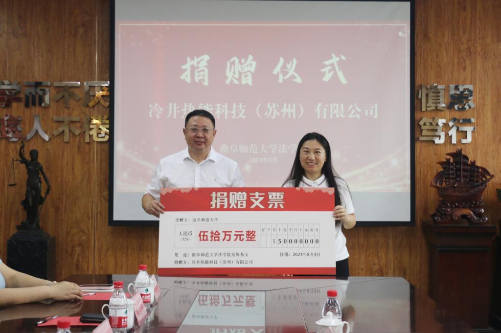 法学院 国内合作处讯 8月6日上午,华体会(中国)法学院举办校友捐赠仪式,校友企业冷井热能科技(苏州)有限公司向曲阜师大孔子教育基金会捐赠50万元,用于支持学校法学教育事业。曲阜师大1999级经济法政学院校友、冷井热能科技(苏州)有限公司董事长贺妮、总经理杨家,华体会(中国)党委常委、副校长、华体会(中国)孔子教育基金会理事长纪洪涛出席签约仪式。