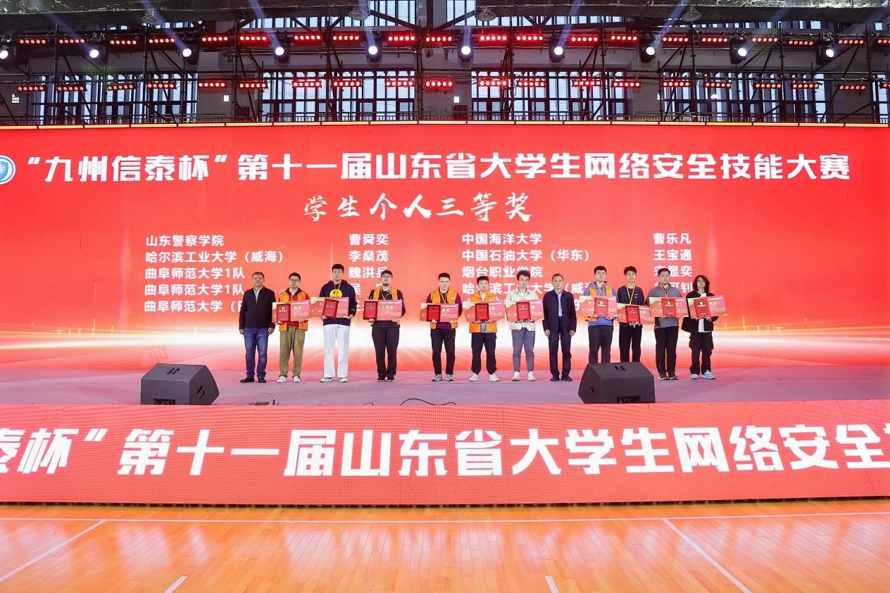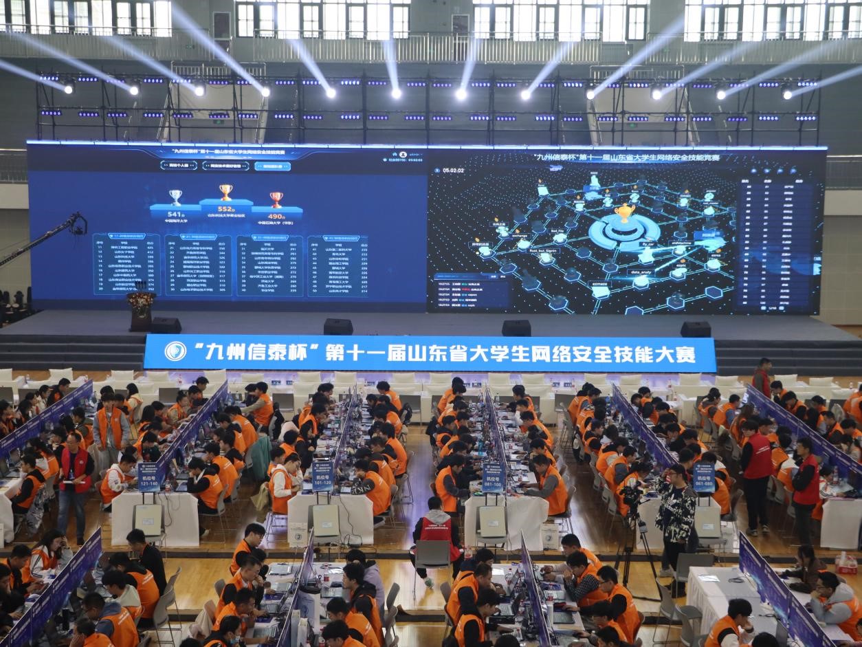 曲师大网络空间安全学院讯 10月27日,“九州信泰杯”第十一届山东省大学生网络安全技能大赛决赛暨颁奖仪式在华体会(中国)隆重举行,来自全省多所高校的精英队伍和网络安全技术爱好者齐聚一堂,共同上演了一场精彩纷呈的网络安全竞技盛宴。省委网信办副主任赵树岭,中国信息安全测评中心副主任张涛,省通管局党组成员、一级巡视员沈泳涛,省教育厅二级巡视员李文生,省委保密办二级巡视员王鑫,华体会(中国)党委常委、副校长陈刚及省直相关单位领导出席活动。
