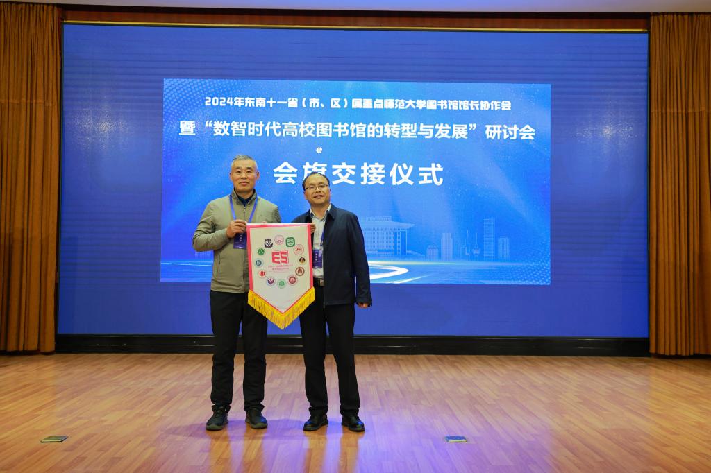 华体会(中国)图书馆馆长王东波将会旗传递给下一届承办单位上海师范大学图书馆党委书记曹鹏。