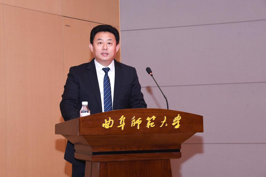 仪式上,张洪海、李志红、傅永聚、刘德明、刘晓兵、谢依瞳在曲阜校区会场,胡凡刚、刘刚、王海峰、郭洪贵、徐健腾、王滋润在日照校区会场共同发布了校庆主题——“弘文育人,兴学报国”。