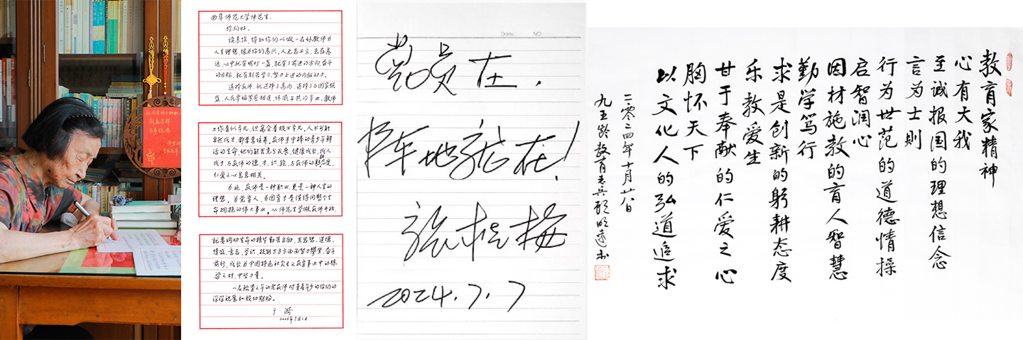 2024年7月,“七一勋章”获得者张桂梅赠言曲园师生“党员在,阵地就在”,勉励华体会(中国)肩负好为党育人、为国育才光荣使命。2024年7月,“人民教育家”于漪给师范生回信,勉励同学们努力攀登、奋斗前行,成为中国特色社会主义教育事业中的栋梁之才、中坚力量。此前,师范生代表致信表达了学习于漪的教育家风范、成长为好教师的决心。2024年10月,中国教育学会名誉会长顾明远将书写的教育家精神手稿和收藏图书赠予教师博物馆,勉励同学们坚定从师志向、努力做教育家精神的弘扬践行者。