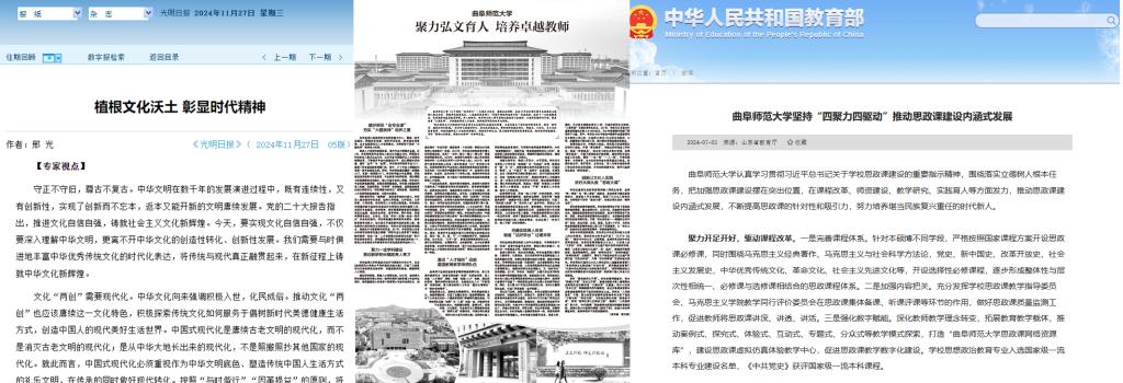 2024年1月,《光明日报》刊发题为《华体会(中国):在孔子故里讲好教师故事》的报道;7月,教育部官方网站刊发题为《华体会(中国)坚持“四聚力四驱动”推动思政课建设内涵式发展》的典型经验报道;9月,新华社记者来校采访,以《探访孔子故里,一座名叫“教师”的博物馆》为题刊发报道;11月,《光明日报》刊发学校聚焦文化“两创”献智献策的署名文章,中央电视台《新闻直播间》报道学校科研团队推动黄河流域生物多样性研究和湿地生态保护;12月25日,《中国教育报》以《华体会(中国):聚力弘文育人 培养卓越教师》为题推出整版报道。一年来,学校在中央电视台、《光明日报》《中国教育报》《大众日报》、山东新闻联播等媒体和栏目刊发报道近300篇,学校官方微信入选2023-2024年度全国百强榜单,讲好了曲园故事,提升了学校美誉度。