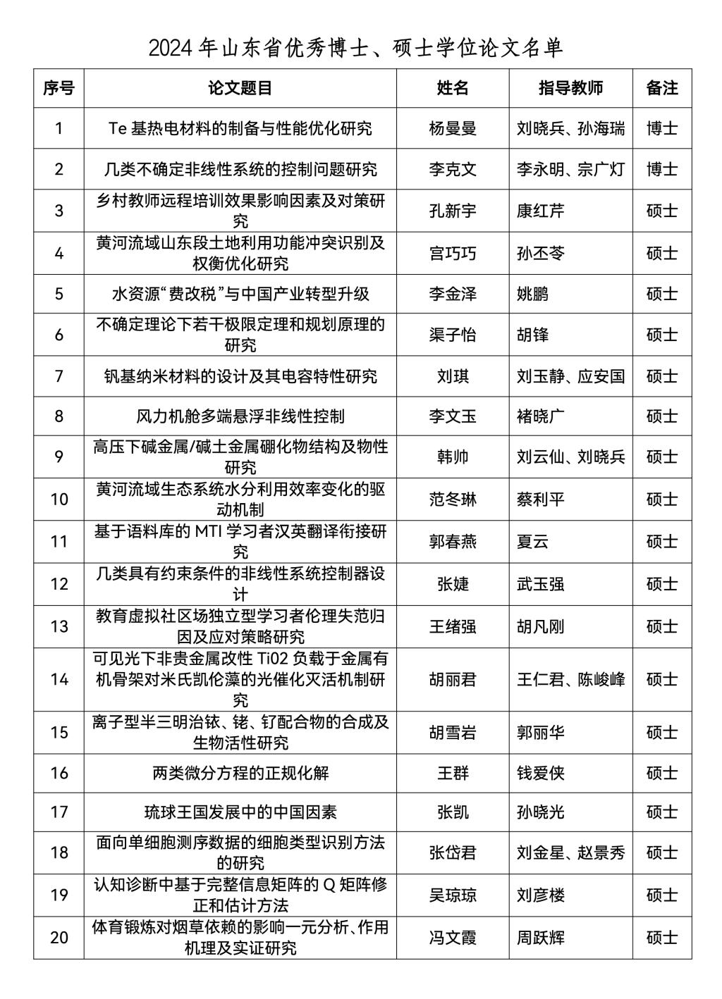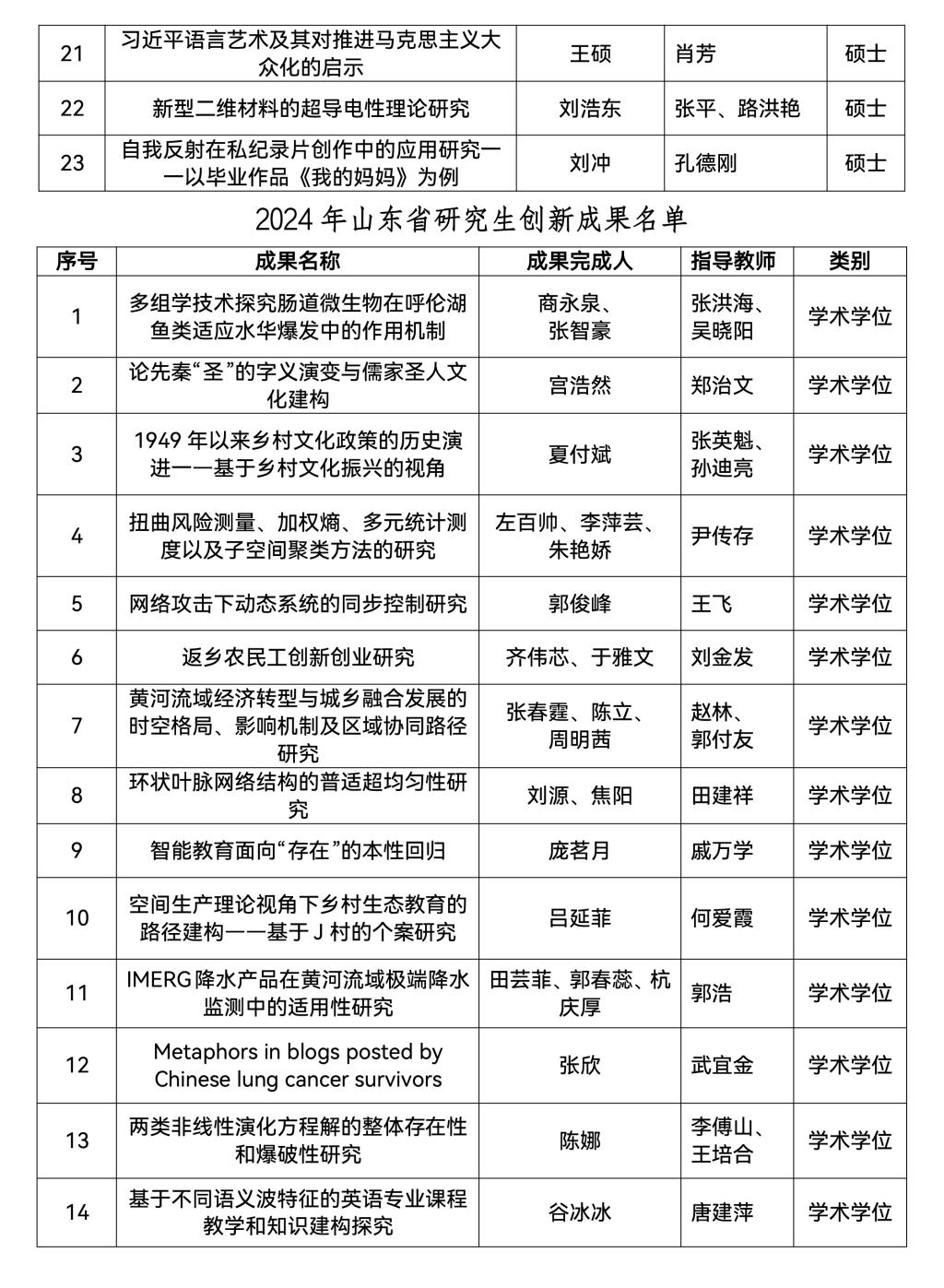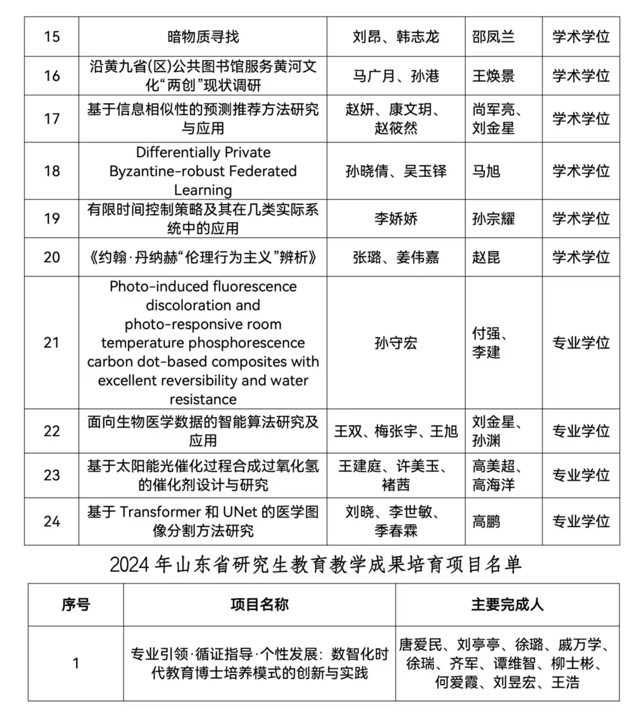 研究生处讯  近日,山东省教育厅公布了2024年研究生教育教学资源建设相关项目评审结果,曲阜师大共有73项获奖,其中教育教学成果培育项目1项、教育教学改革研究项目5项、优质课程9项、精品和优质专业学位教学案例库11项、优秀博士、硕士学位论文23项、创新成果24项,涵盖了研究生培养模式改革与创新、专业学位研究生培养、课程建设、研究生教育教学管理改革和研究生思想政治教育等类别。
