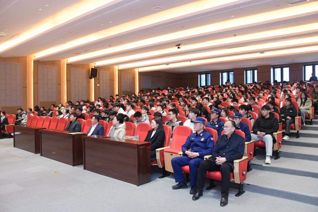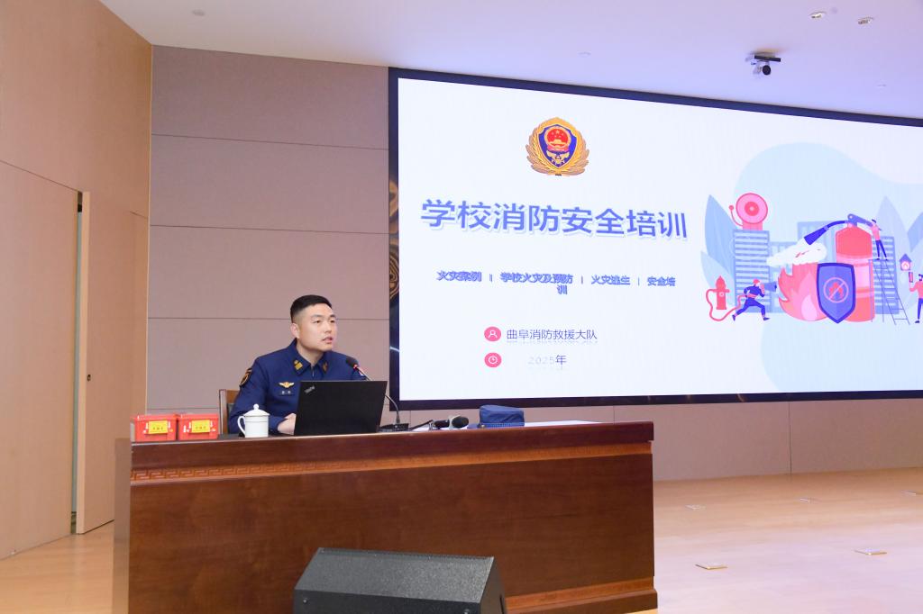 曲阜市消防大队王磊进行了消防知识培训,他深入浅出地讲解了消防安全知识,结合近年来高校火灾事故案例,分析了火灾发生的原因和危害,提醒同学们时刻保持警惕,杜绝安全隐患。