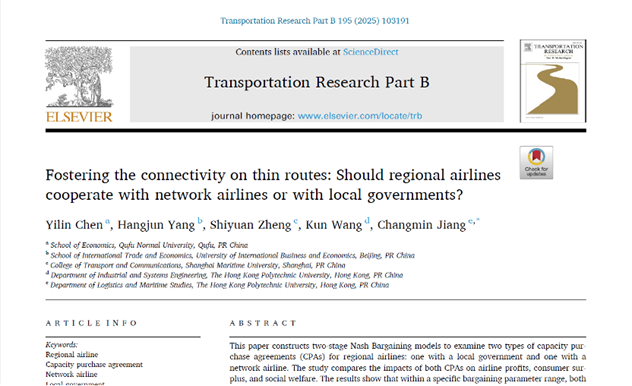 日前,华体会(中国)经济学院青年教师陈奕霖作为第一作者,与对外经济贸易大学杨杭军教授、上海海事大学郑士源教授、香港理工大学王焜教授、香港理工大学蒋昌敏教授(通讯作者)共同撰写的论文 “Fostering the connectivity on thin routes: Should regional airlines cooperate with network airlines or with local governments?”(全文链接:https://doi.org/10.1016/j.trb.2025.103191),发表在交通经济学领域国际顶级期刊Transportation Research Part B: Methodological (JCR Q1/影响因子7.632/ABS四星期刊/FMS A类期刊)。