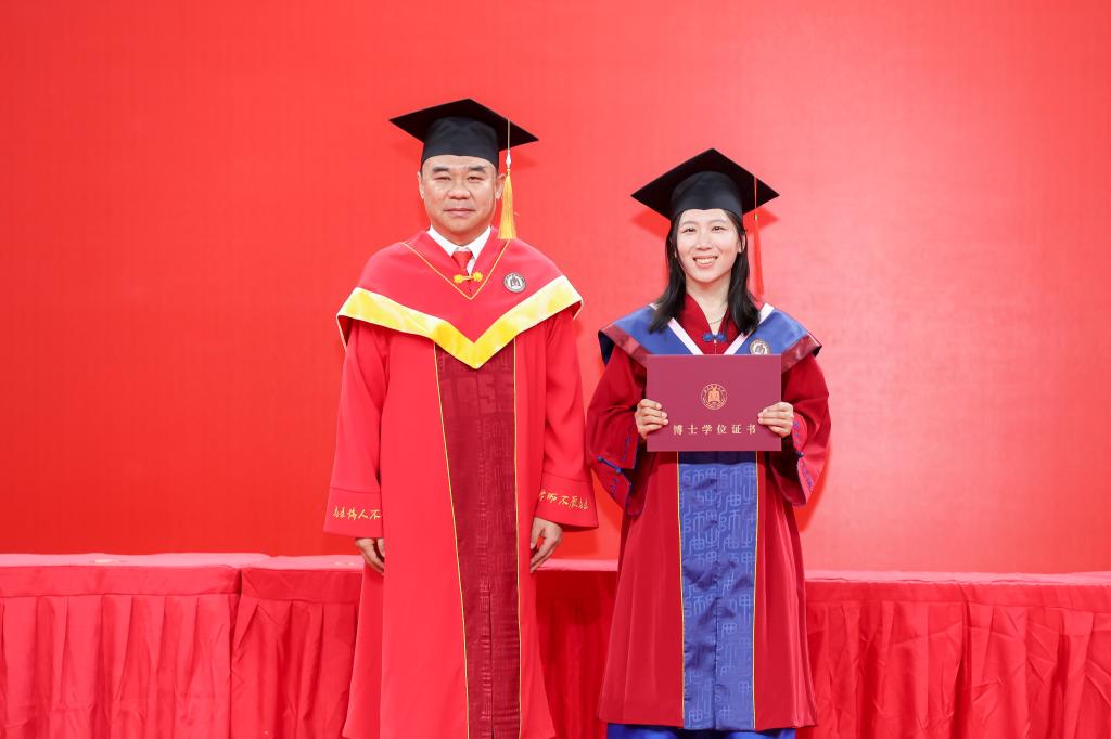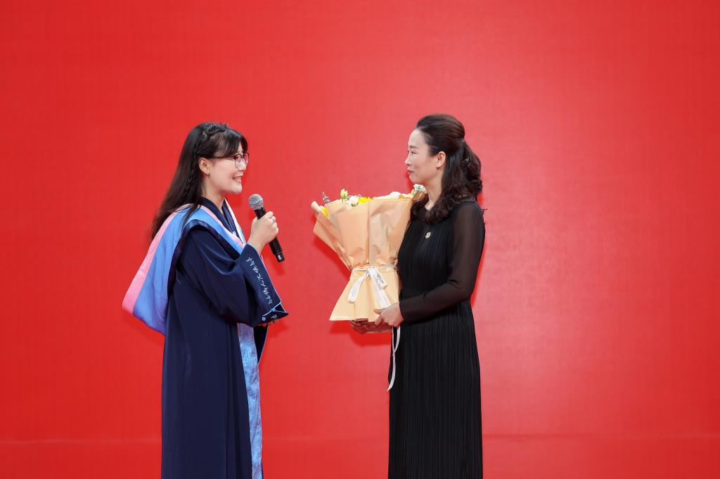 当毕业学子在典礼上为他们评选出的“我喜爱的曲园好老师”献花时,马克思主义学院2025届硕士研究生郭新华与导师肖芳在问答之间诠释出师道传承。郭新华表示自己也将成为一名教师,她将认真教好每一堂课,传承好从导师身上所学的杏坛师道。