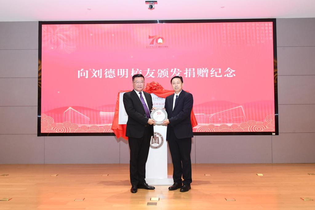 张洪海接受刘德明校友捐赠,并为其颁发捐赠纪念。