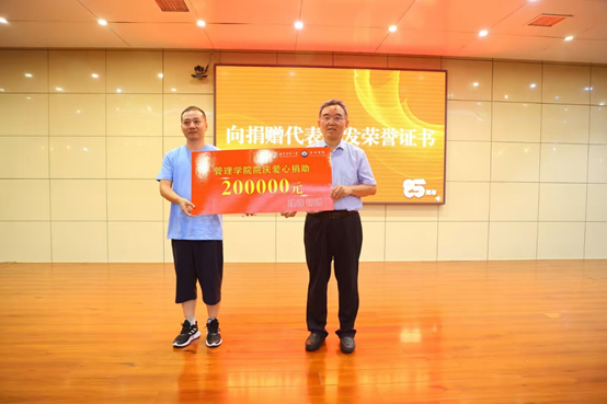 本次庆典还举行了校友奖助学金捐赠仪式。青岛精耕国际物流有限公司董事长、2001级校友魏峰为管理学院捐赠奖助学金20万元。学院院长王宜举代表学院接受捐赠并为魏峰校友颁发捐赠证书。