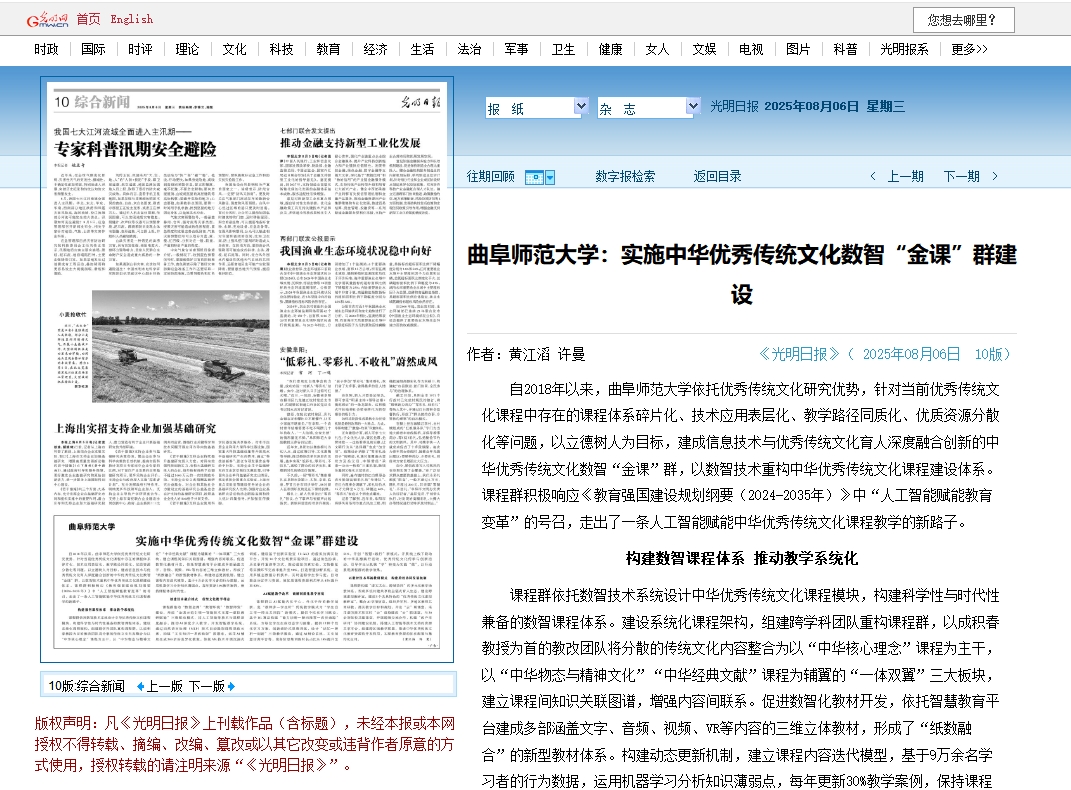 华体会官方网讯 8月6日,《光明日报》以《华体会(中国)实施中华优秀传统文化数智“金课”群建设》为题,报道了学校积极响应《教育强国建设规划纲要(2024-2035年)》中“人工智能赋能教育变革”的号召,依托优秀传统文化研究优势,聚焦优秀传统文化课程中存在的课程体系碎片化、技术应用表层化、教学路径同质化、优质资源分散化等问题,以数智技术重构中华优秀传统文化课程建设体系,建成信息技术与优秀传统文化育人深度融合创新的中华优秀传统文化数智“金课”群,走出了一条人工智能赋能中华优秀传统文化课程教学新路子的特色实践。