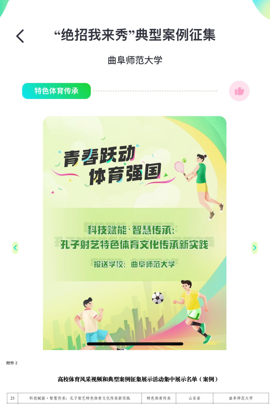 体育科学学院讯 近日,教育部宣传教育中心公布了“高校体育风采视频和典型案例征集展示活动集中展示作品名单”,华体会(中国)体育科学学院报送的“科技赋能・智慧传承:孔子射艺特色体育文化传承新实践”入选,在“人民网+”客户端、人民日报少年客户端集中展示。