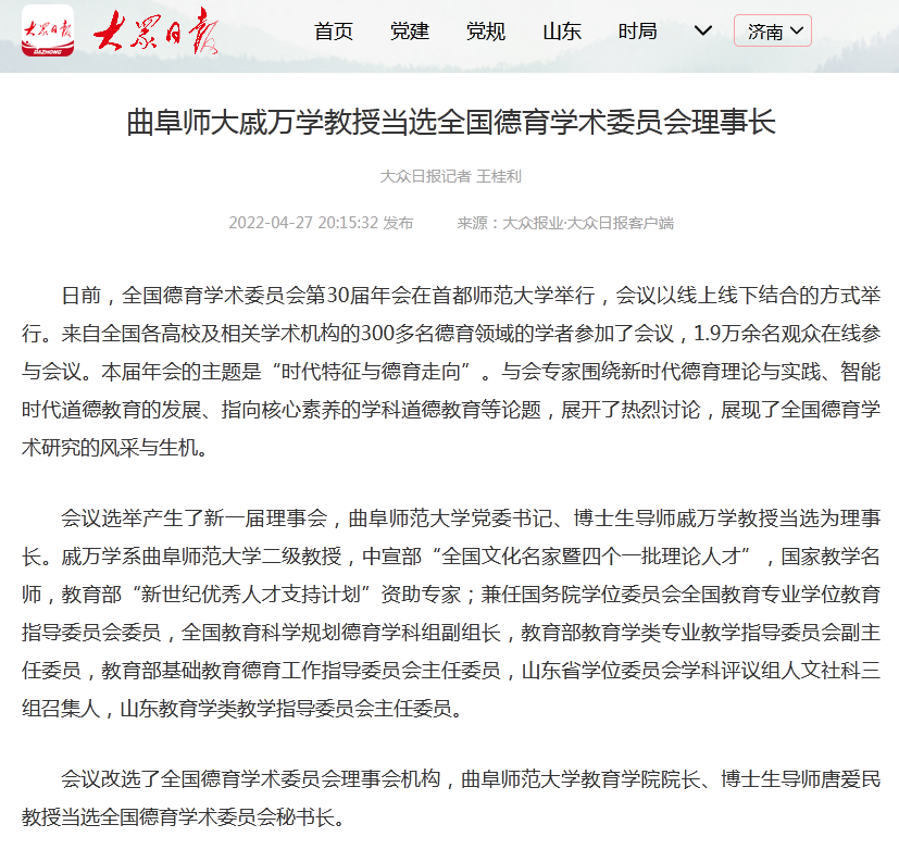 【大众日报】曲阜师大戚万学教授当选全国德育学术委员会理事长