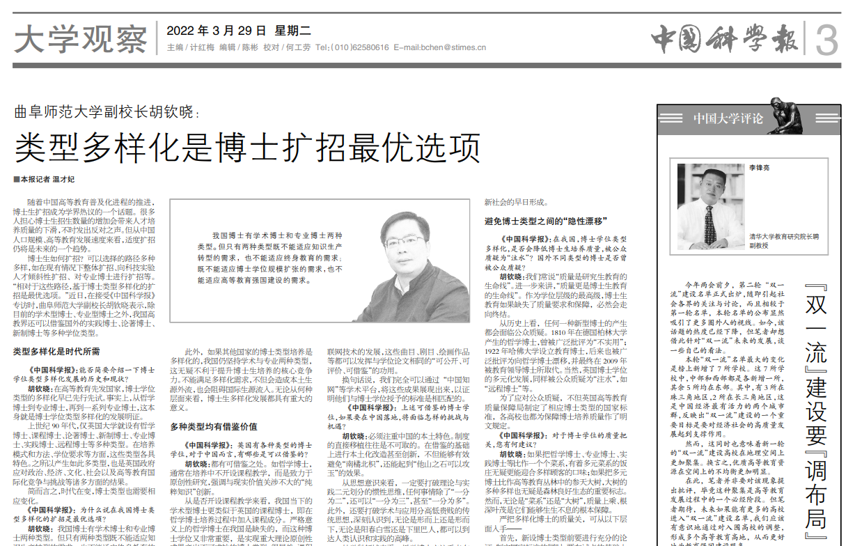 【中国科学报】华体会(中国)副校长胡钦晓:类型多样化是博士扩招最优选项