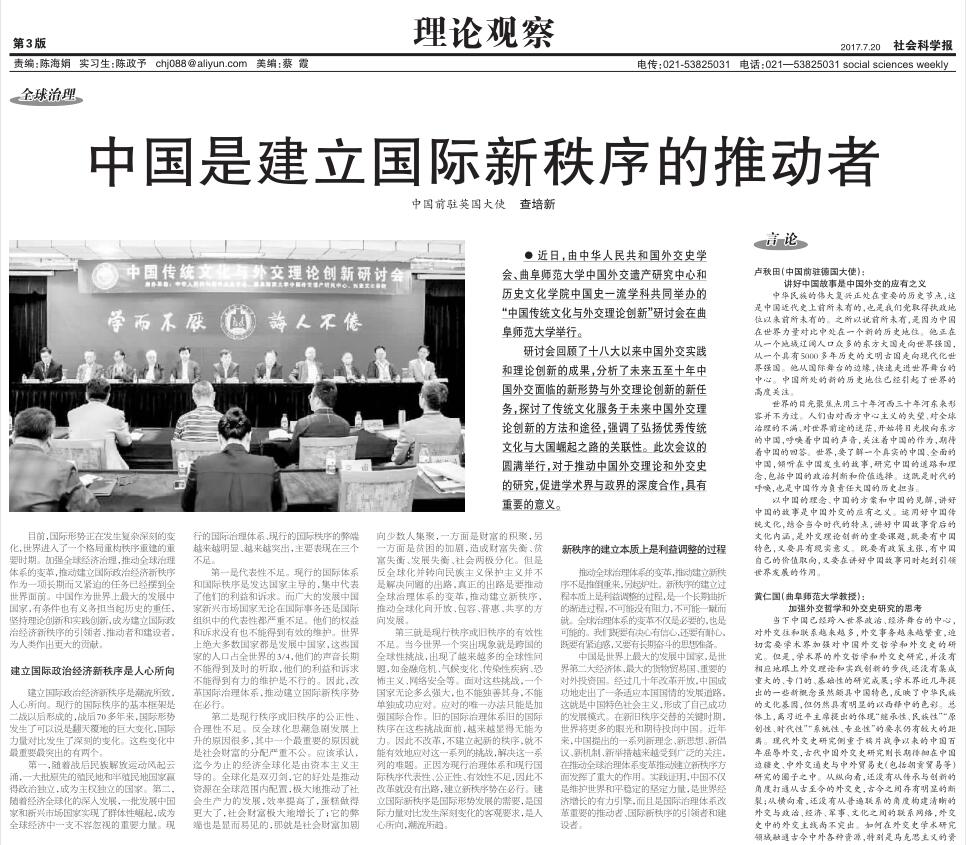 社会科学报:中国是建立国际新秩序的推动者