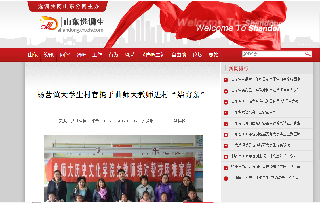 为庆祝“三八丽人节”,历史文化学院工会在院党委的领导支持下,组织全院女教工到济宁市梁山县杨营镇,给机关干部宣讲廉政文化,和杨营镇中心小学贫困家庭儿童结对爱心帮扶,度过了一个不同寻常的节日。该活动被多家媒体宣传报道,以下为部分媒体报道统计: