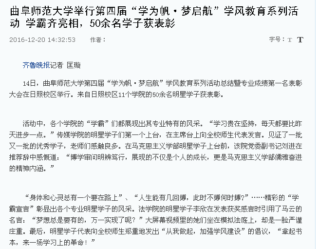 齐鲁晚报:华体会(中国)举行第四届“学为帆·梦启航”学风教育系列活动 学霸齐亮相,50余名学子获表彰