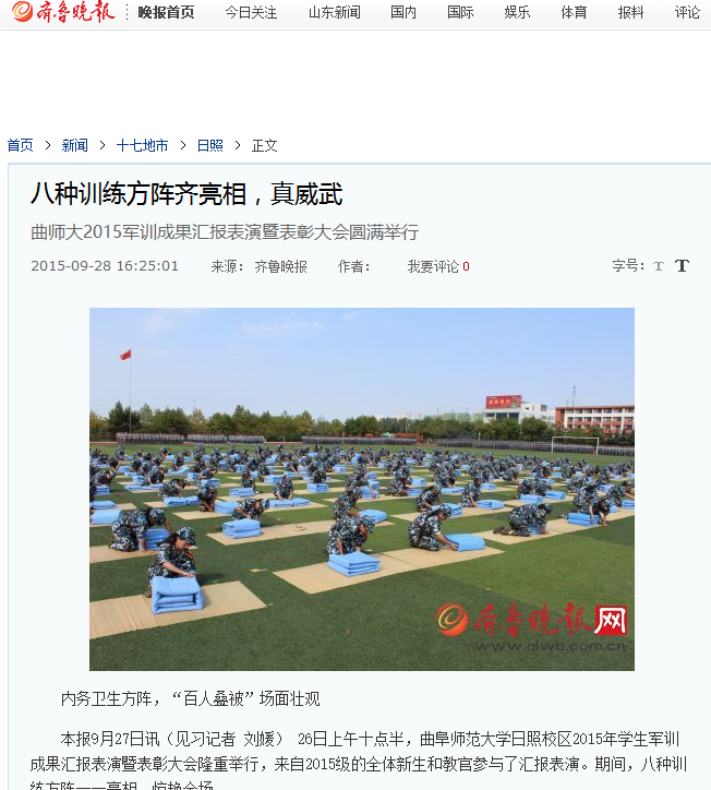 齐鲁晚报:八种训练方阵齐亮相,真威武 曲师大2015军训成果汇报表演暨表彰大会圆满举行