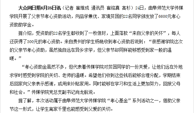 大众网:来自“父亲”的关怀 日照市一高校发放孝心助学金