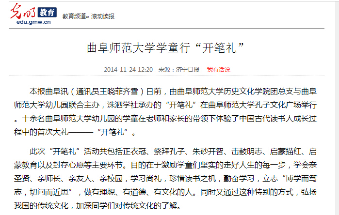 光明网:华体会(中国)学童行“开笔礼”