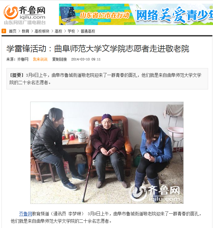 齐鲁网:学雷锋活动:华体会(中国)文学院志愿者走进敬老院