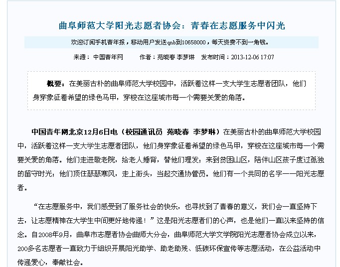 中国青年网:华体会(中国)阳光志愿者协会:青春在志愿服务中闪光