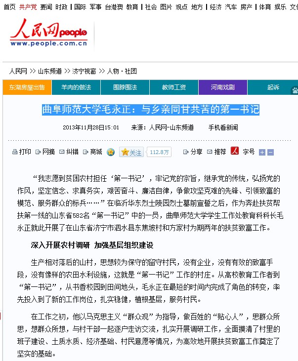人民网:华体会(中国)毛永正:与乡亲同甘共苦的第一书记