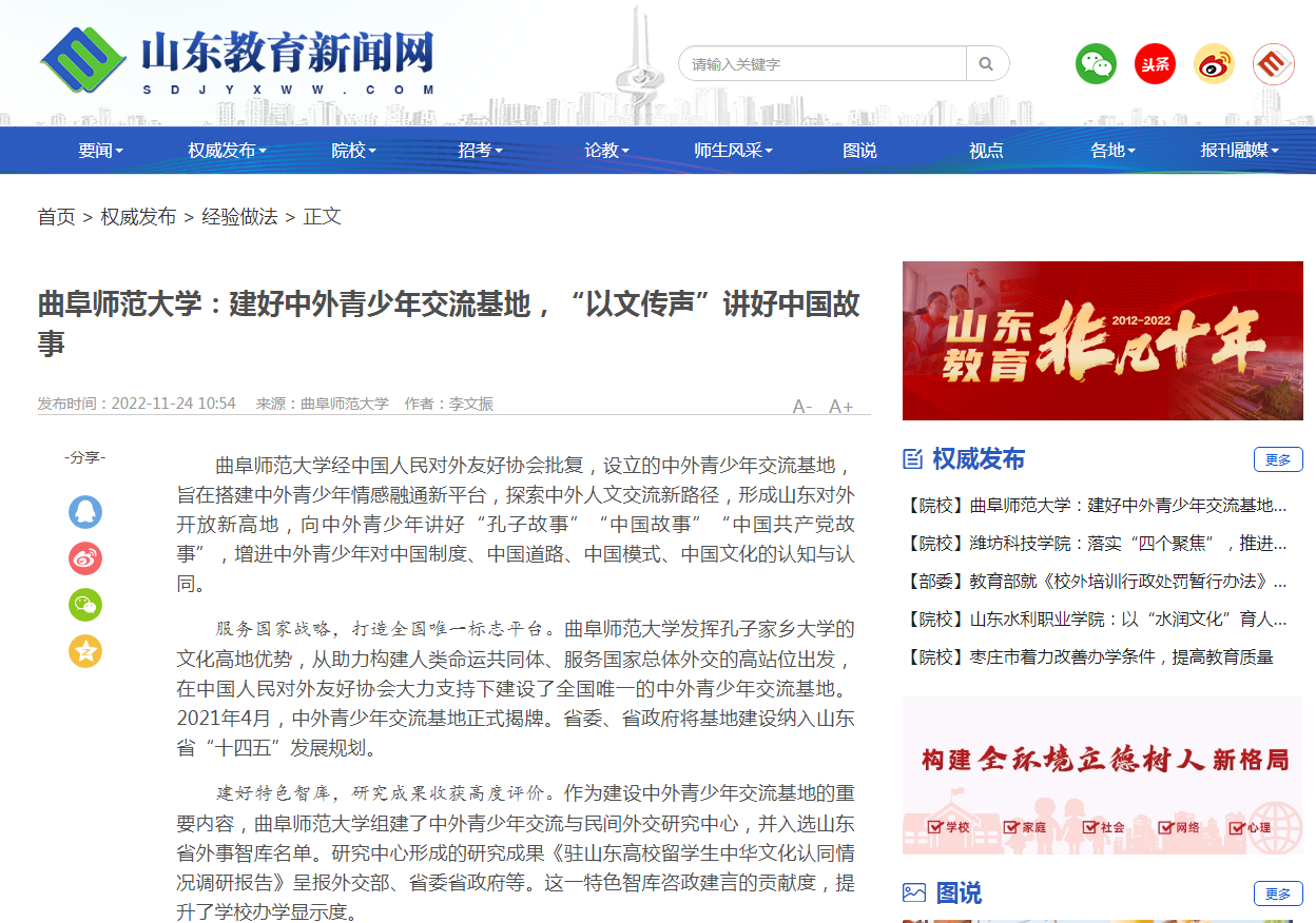 【山东教育新闻网】华体会(中国):建好中外青少年交流基地,“以文传声”讲好中国故事