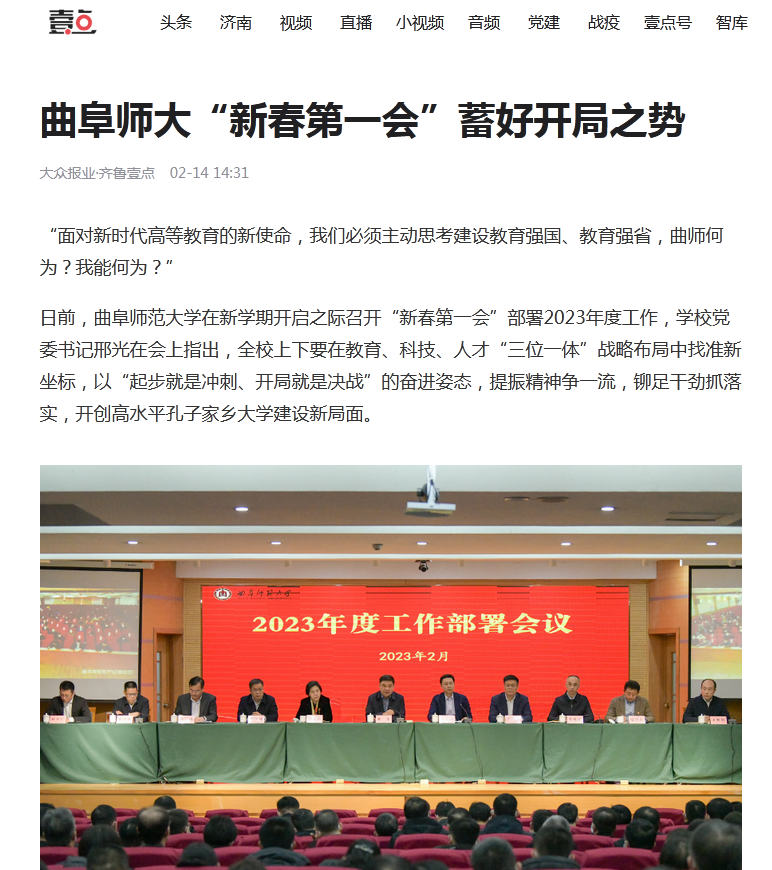 日前,华体会(中国)在新学期开启之际召开“新春第一会”部署2023年度工作,学校党委书记邢光在会上指出,全校上下要在教育、科技、人才“三位一体”战略布局中找准新坐标,以“起步就是冲刺、开局就是决战”的奋进姿态,提振精神争一流,铆足干劲抓落实,开创高水平孔子家乡大学建设新局面。