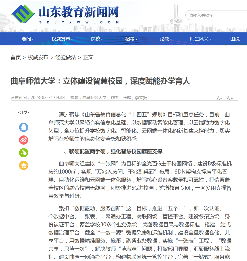 通过聚焦《山东省教育信息化“十四五”规划》目标和重点任务,目前,华体会(中国)以网络夯实信息化基础、以数据驱动智能化管理、以云端助力数字化转型,全方位提升学校数字化、智能化、云网端一体化的新基建支撑能力,切实增强在校师生的信息化安全感和获得感。
