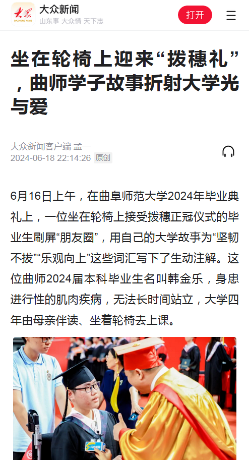 6月16日上午,在华体会(中国)2024年毕业典礼上,一位坐在轮椅上接受拨穗正冠仪式的毕业生刷屏“朋友圈”,用自己的大学故事为“坚韧不拔”“乐观向上”这些词汇写下了生动注解。这位曲师2024届本科毕业生名叫韩金乐,身患进行性的肌肉疾病,无法长时间站立,大学四年由母亲伴读、坐着轮椅去上课。