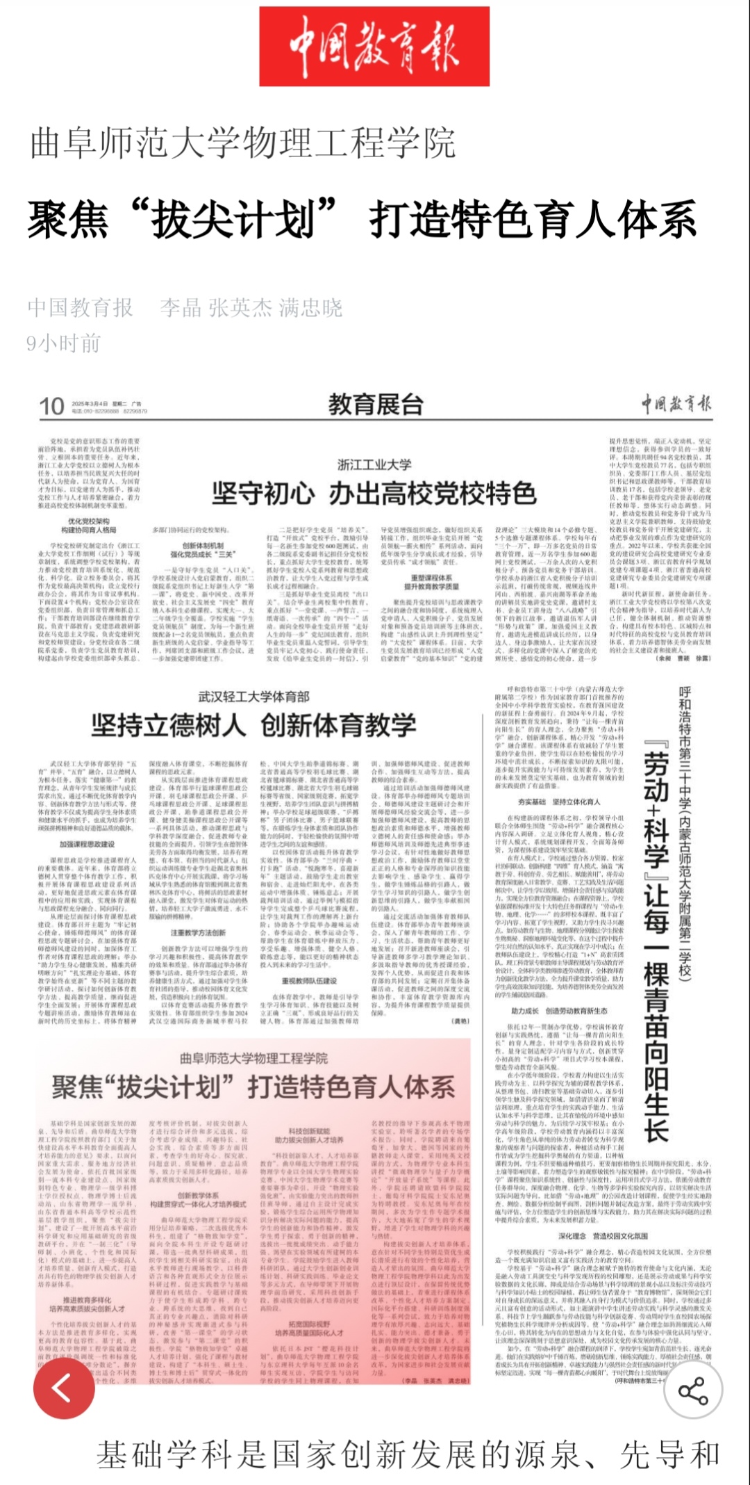 基础学科是国家创新发展的源泉、先导和后盾。华体会(中国)物理工程学院按照教育部门《关于加快建设高水平本科教育全面提高人才培养能力的意见》要求,以面向国家重大需求、服务地方经济社会发展为使命,依托首批国家级别一流本科专业建设点、国家级别特色专业、物理学一级学科博士学位授权点、物理学博士后流动站、山东省物理学一流学科、山东省普通本科高等学校示范性基层教学组织,聚焦“拔尖计划”,建设了一批开展高水平前沿科学研究和应用基础研究的省级教研平台,并在“一制三化”(导师制、小班化、个性化和国际化)模式的基础上,进一步提高人才培养质量、创新育人模式,打造出具有特色的物理学拔尖创新人才培养新体系。